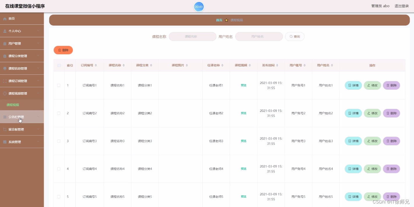 管理员进入到课程视频管理页面可以查看订阅编号、课程名称、课程分类、课程图片、任课老师、课程视频、发布时间、用户账号、用户姓名等信息,进行详情、修改、删除操作,如图所示。