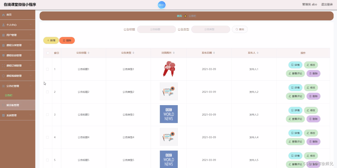 管理员进入公告栏管理页面可以查看公告标题、公告类型、封面图片、发布日期、发布人等信息,进行详情、修改、查看评论、删除操作,如图所示。
