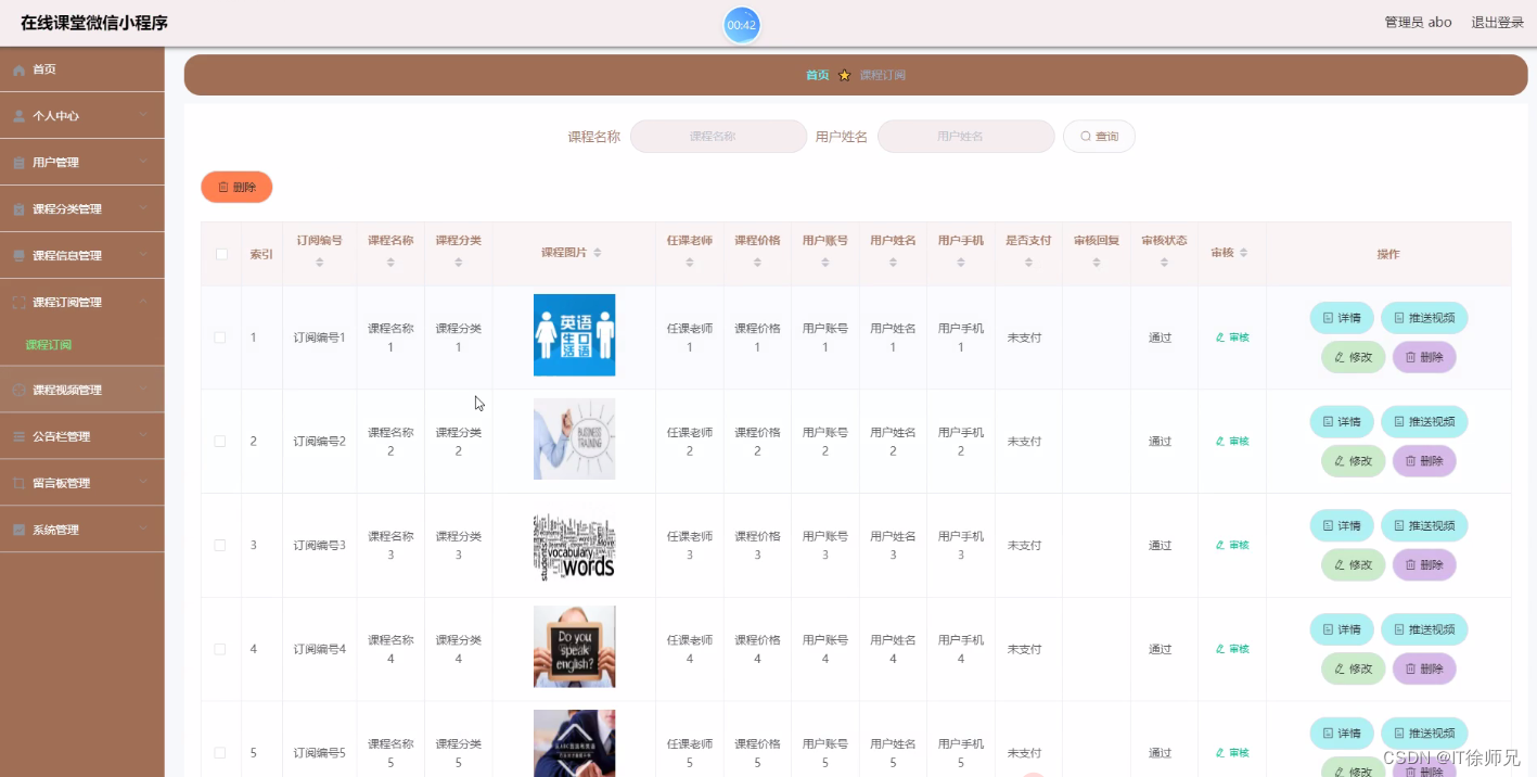管理员进入到课程订阅管理页面可以查看订阅编号、课程名称、课程分类、课程图片、任课老师、课程价格、用户账号、用户姓名、用户手机、是否支付、审核回复、审核状态、审核等信息,进行详情、推送视频、修改、删除操作,如图所示。