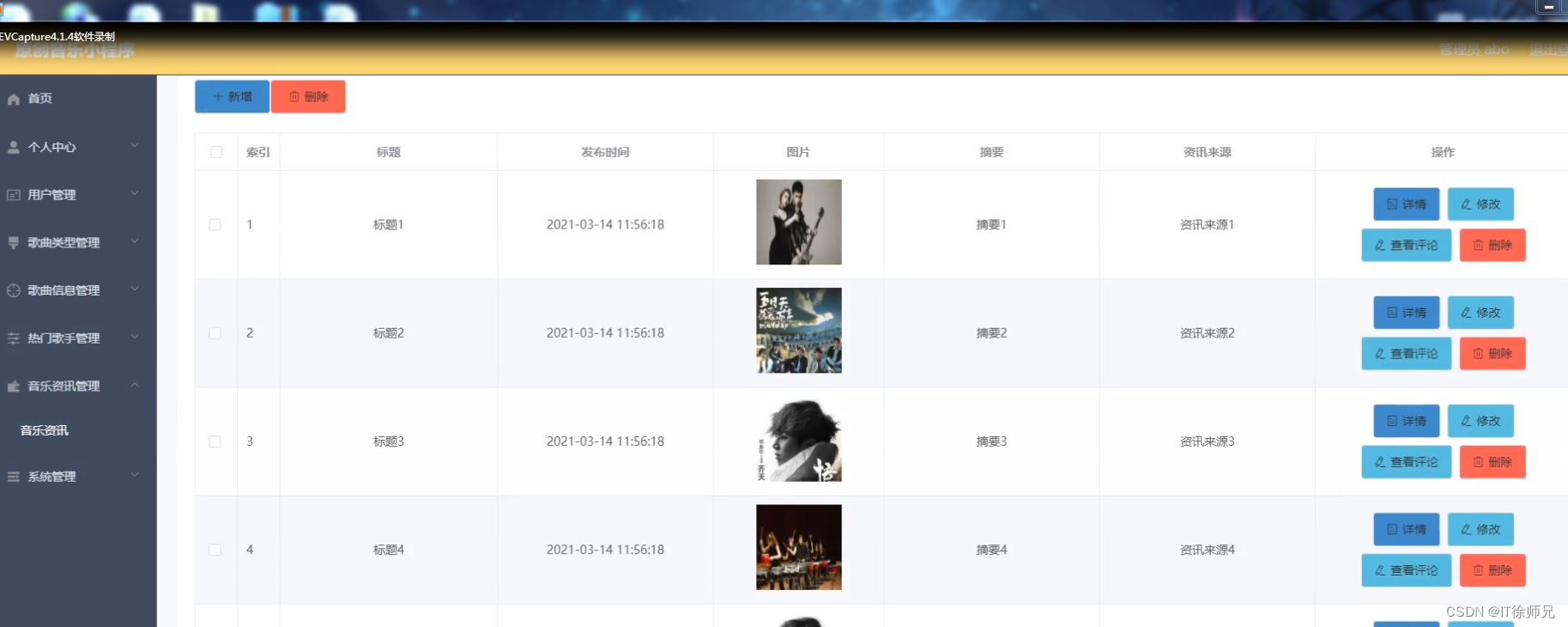 音乐资讯管理:通过列表可以查看标题、发布时间、图片、摘要、资讯来源等信息,进行查看详情或修改或删除操作,并通过音乐资讯进行查看评论,也可以通过填写标题进行查询或重置操作,如图所示。
