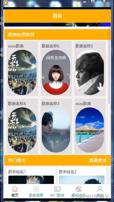 用户进入到原创音乐小程序界面,通过首页可以进行查看首页、歌曲信息、热门歌手、音乐资讯、我的等功能模块,进行相对应操作,如图所示。