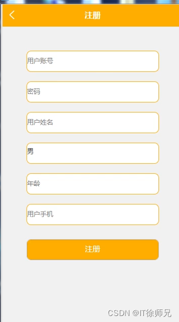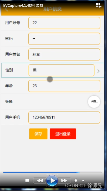 用户信息:通过列表可以进行输入用户账号、密码、用户姓名、性别、年龄、头像、用户手机等信息,进行保存或退出登录操作,如图所示。