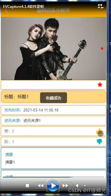 音乐资讯:通过列表可以查看标题、发布时间、图片、摘要、资讯来源等信息,进行查看音乐资讯信息、或进行收藏资讯或进行查看评价信息或在线评价操作,如图所示。