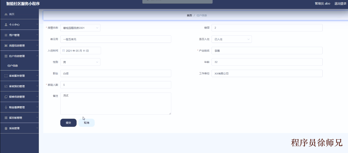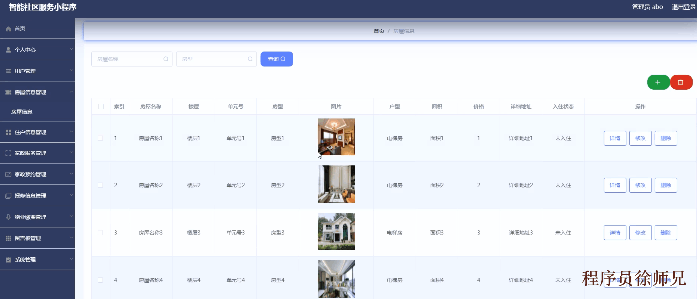 系统管理员可以对住户信息进行添加,修改,删除以及查询操作。界面如下图所示: