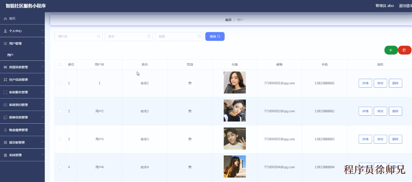 智能社区服务小程序的系统管理员可以管理用户,可以对用户信息修改删除以及查询操作。具体界面的展示如图5.1所示。
