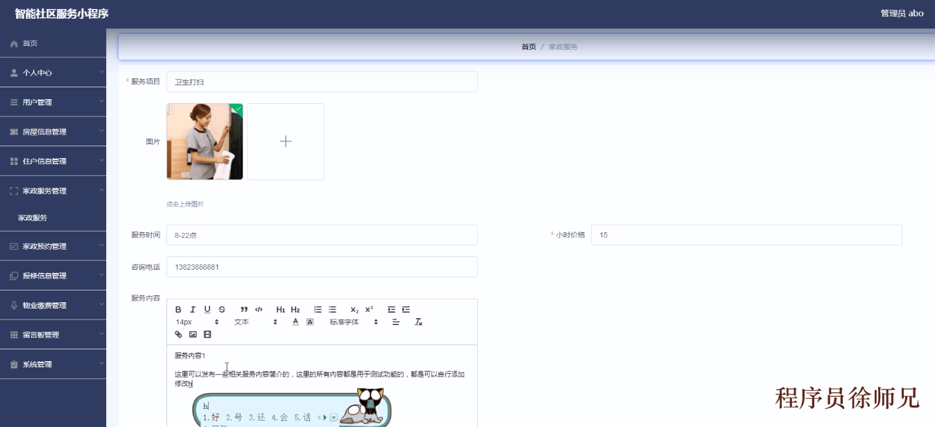 系统管理员可以对家政服务进行添加修改删除操作。界面如下图所示: