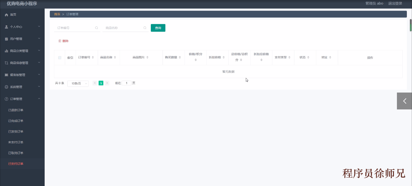 订单管理,通过填写订单编号、商品名称、商品图片、购买数量、价格/积分、折扣价格、总价格/总积分、折扣总价格、支付类型、状态、地址等信息进行详情、修改操作,如图5-17所示。