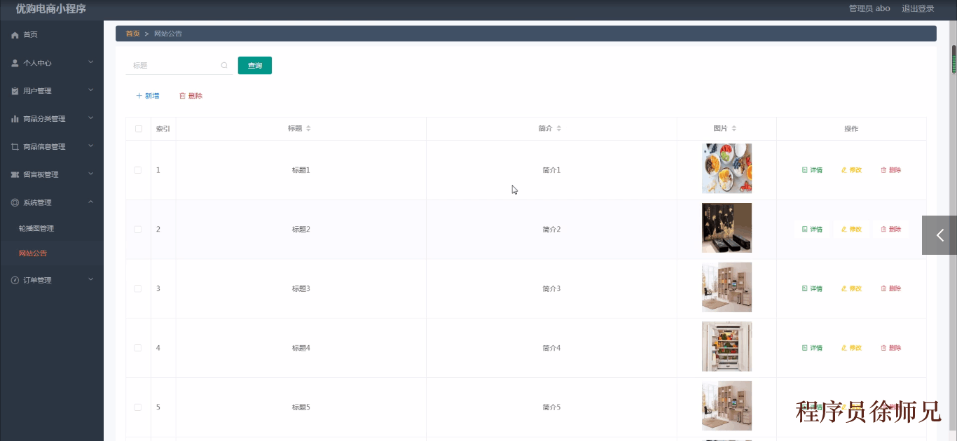 网站公告,通过填写标题、简介、图片等信息进行详情、修改、删除操作,如图5-16示。