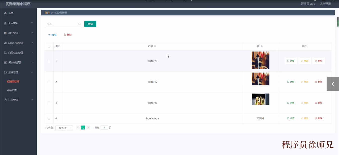 该页面为轮播图管理界面。管理员可以在此页面进行首页轮播图的管理,通过新建操作可在轮播图中加入新的图片,还可以对以上传的图片进行修改操作,以及图片的删除操作,如图5-18所示。