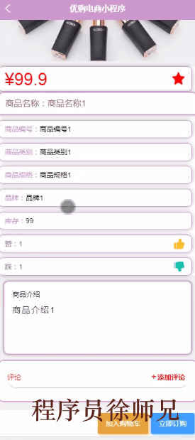 商品信息,在商品信息页面可以查看商品编号、商品名称、商品类别、商品规格、图片、品牌、价格、单限、库存等信息进行加入购物车、立即购买,如图5-4所示。