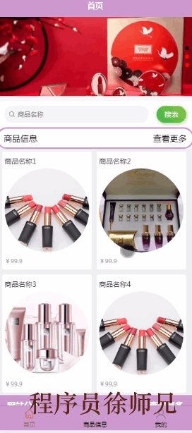用户登录到优购电商小程序可以查看首页、商品信息、我的等内容,如图5-3所示。