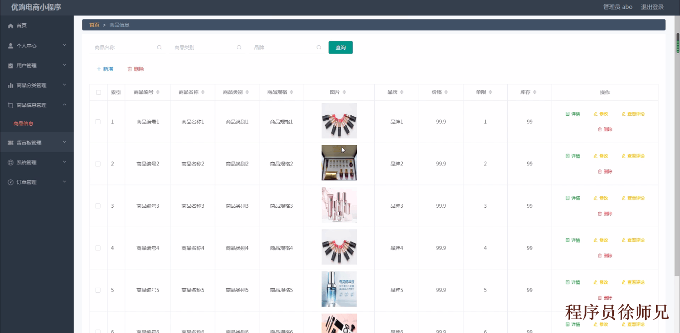 商品信息管理,通过填写商品编号、商品名称、商品类别、商品规格、图片、品牌、价格、单限、库存等信息进行详情、修改、删除操作,如图5-14所示。