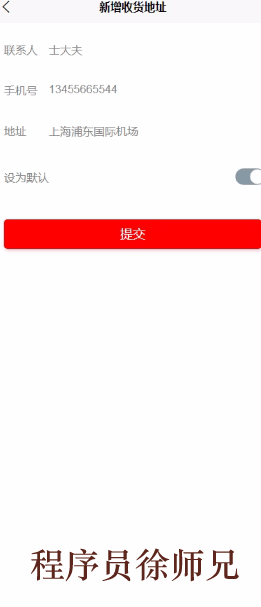 在新增收货地址页面可以查看联系人、手机号、地址、设为默认等内容,并可根据需要进行提交,如图5-8所示。