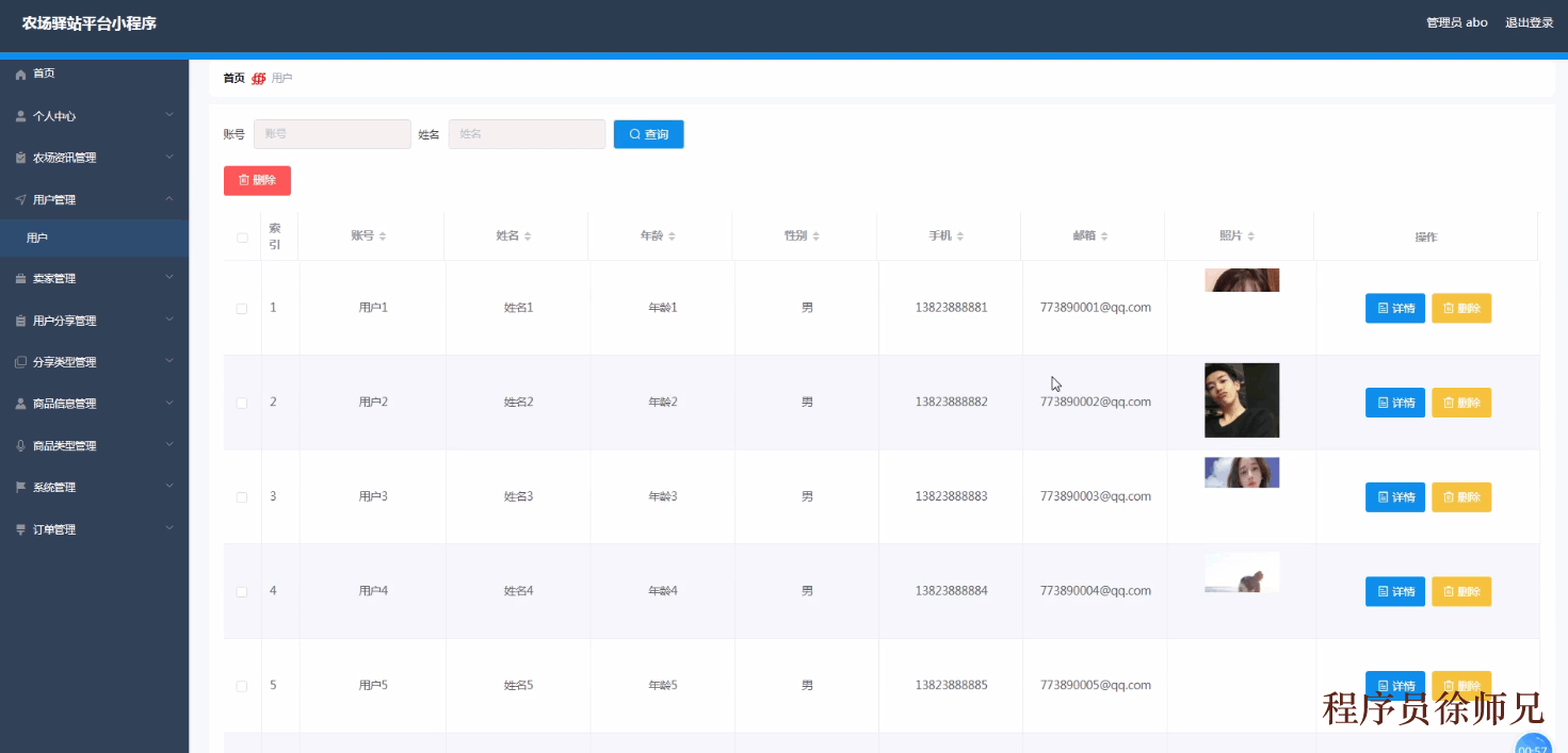 用户管理,可以查看账号、姓名、年龄、性别、手机、邮箱、照片等信息进行详情、删除操作,如图5-13所示。