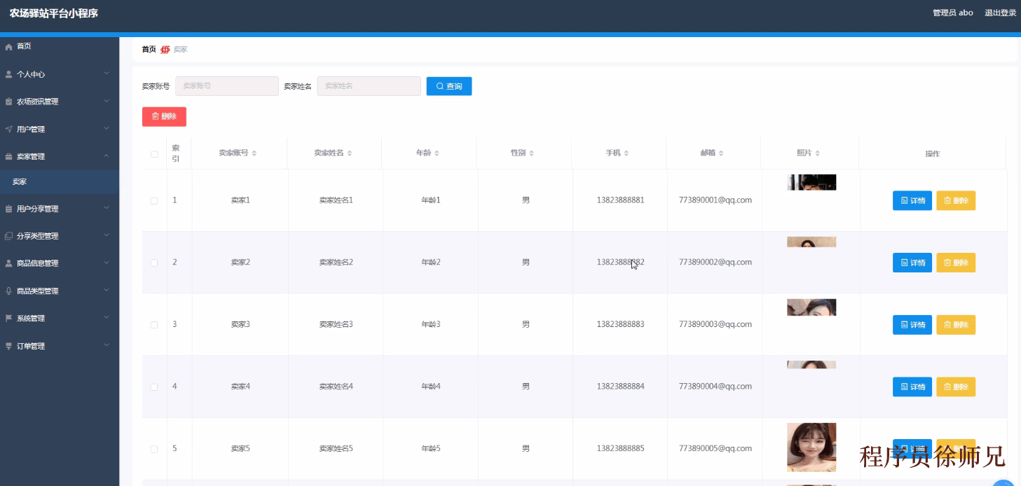 卖家管理,可以查看卖家账号、卖家姓名、年龄、性别、手机、邮箱、照片等信息进行详情、删除操作,如图5-14所示。