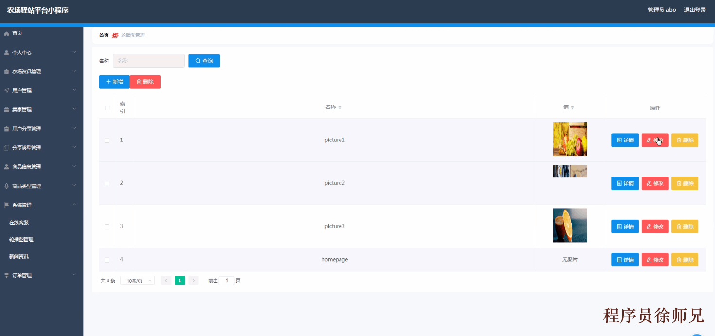 轮播图;该页面为轮播图管理界面。管理员可以在此页面进行首页轮播图的管理,通过新建操作可在轮播图中加入新的图片,还可以对以上传的图片进行修改操作,以及图片的删除操作,如图5-17所示。