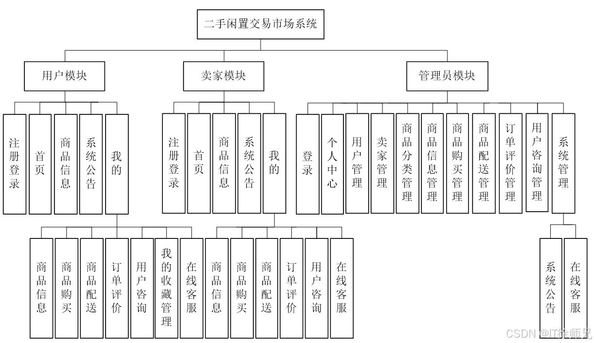 本基于微信小程序的二手闲置交易市场系统主要实现了卖家功能模块、用户功能模块和管理员功能模块三大部分,系统结构图如图所示。