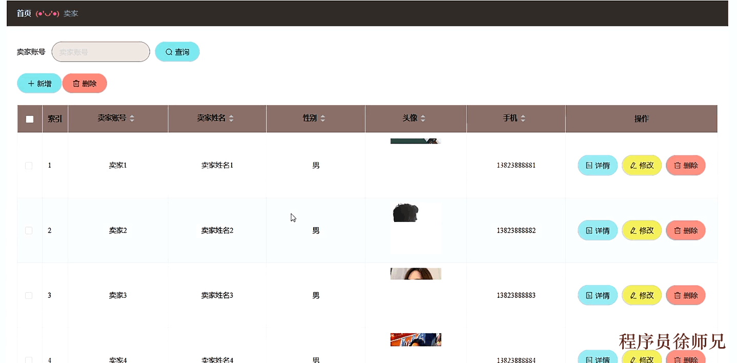 管理员在卖家管理界面可查看所有卖家信息,对已有卖家信息可进行编辑和删除操作,同时也可添加卖家信息,卖家管理界面如图5.9所示。