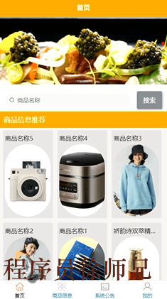 没有账号的用户可进行注册操作,注册登录后主要功能模块包括首页、商品信息(商品查询收藏购买)、系统公告以及我的(商品信息、商品购买、商品配送、订单评价、用户咨询、我的收藏管理以及在线客服)。