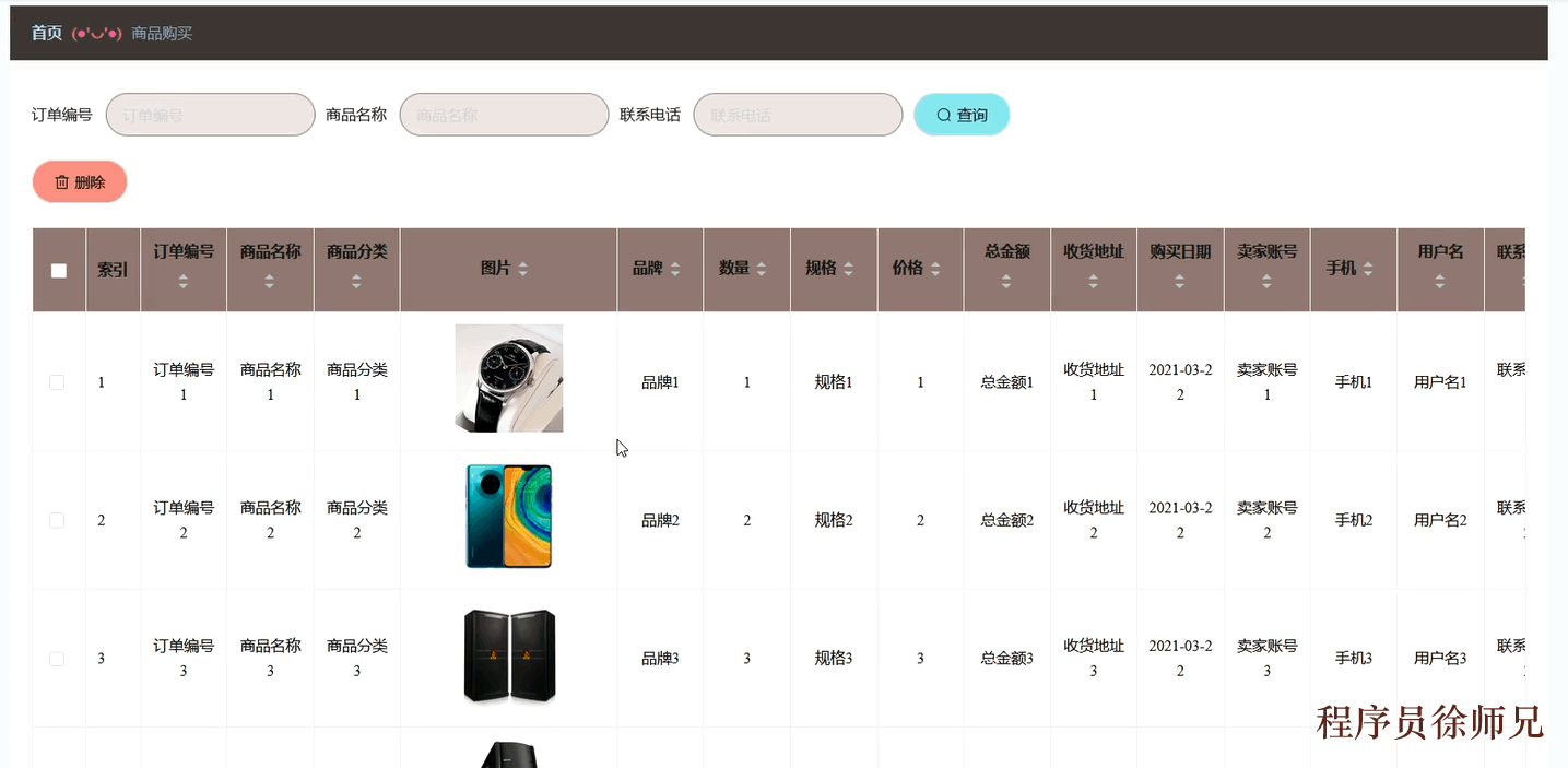 管理员可进入商品购买管理界面查看所有购买信息,商品购买管理界面展示如图5.11所示。