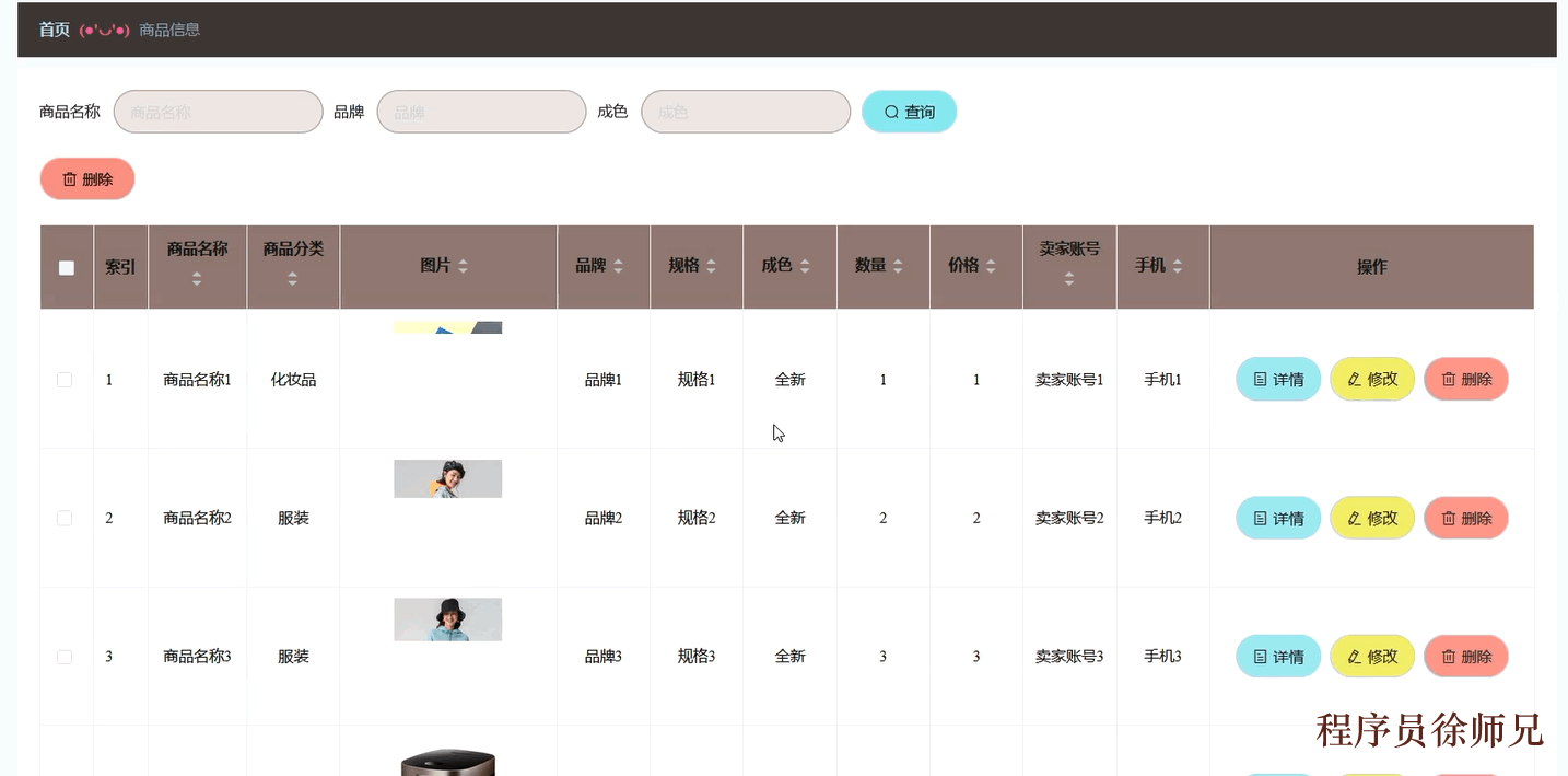 用户登录后可查看商品信息,并可根据条件快速查询所需商品,可选择商品进行查看详情操作,卖家登录后可管理商品信息,能够新增商品,商品信息界面展示如图5.3所示。