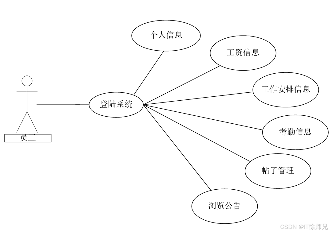 员工的用例包括浏览工资信息、部门信息,工作安排信息、考勤信息以及修改个人资料、发布帖子。员工用例图如下图所示: