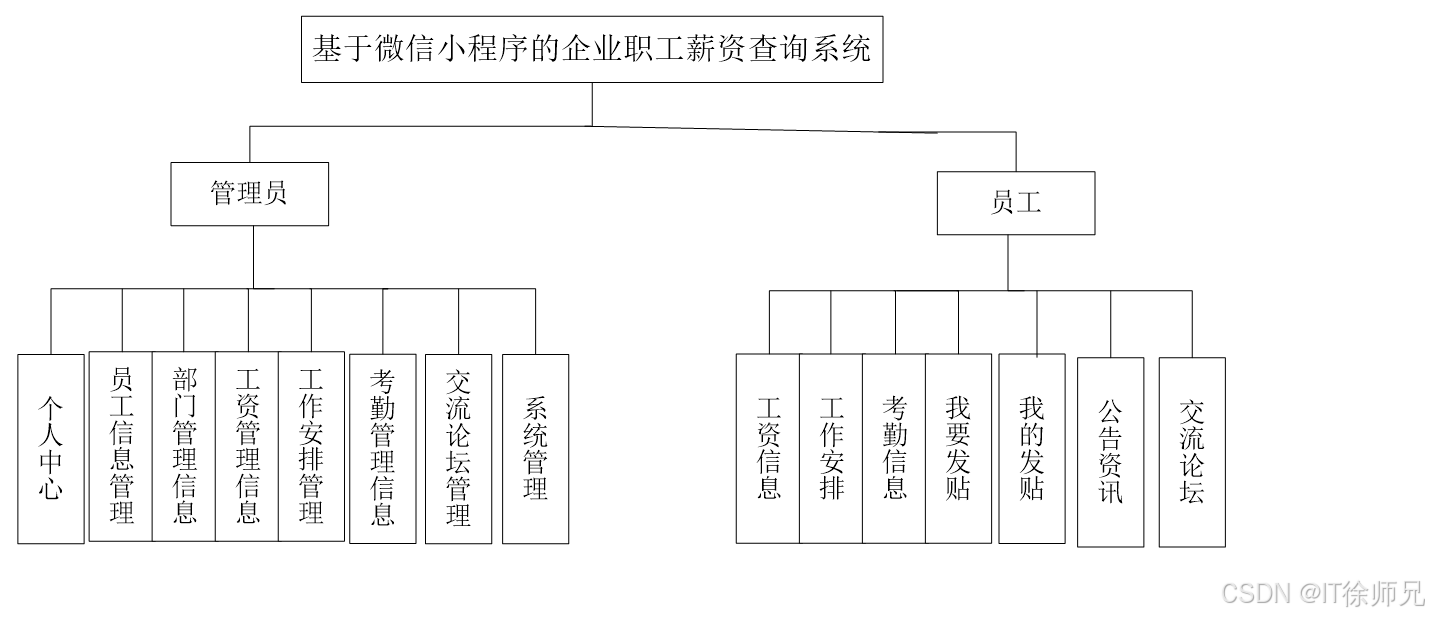 一个好的设计不止是功能完整,操作流畅,还要符合用户的审美和界面的友好。在进入正式系统实施前,不可缺少的步骤为系统的总体结构设计,本系统为实用性的系统,所以开发的功能都是针对工资信息相关的。本系统的结构可以分为管理员界面和员工功能界面。本系统的总体结构图如下图所示: