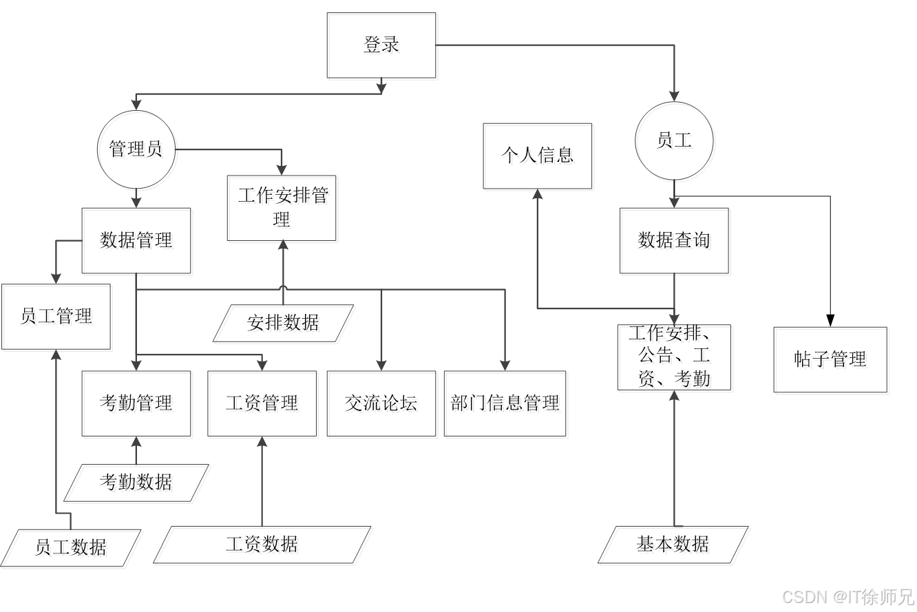 本系统的流程为先进行登录,在登录中需要输入账号和密码并选择相对应的身份才可以登录成功,管理员登录后的功能主要为管理,员工登录后的功能主要为查看。本系统中的主要功能有工资信息、考勤信息、工作安排信息、部门信息,公告信息等,在本系统中员工也可以修改个人资料和参与论坛讨论。用户登录流程图如下图所示:
