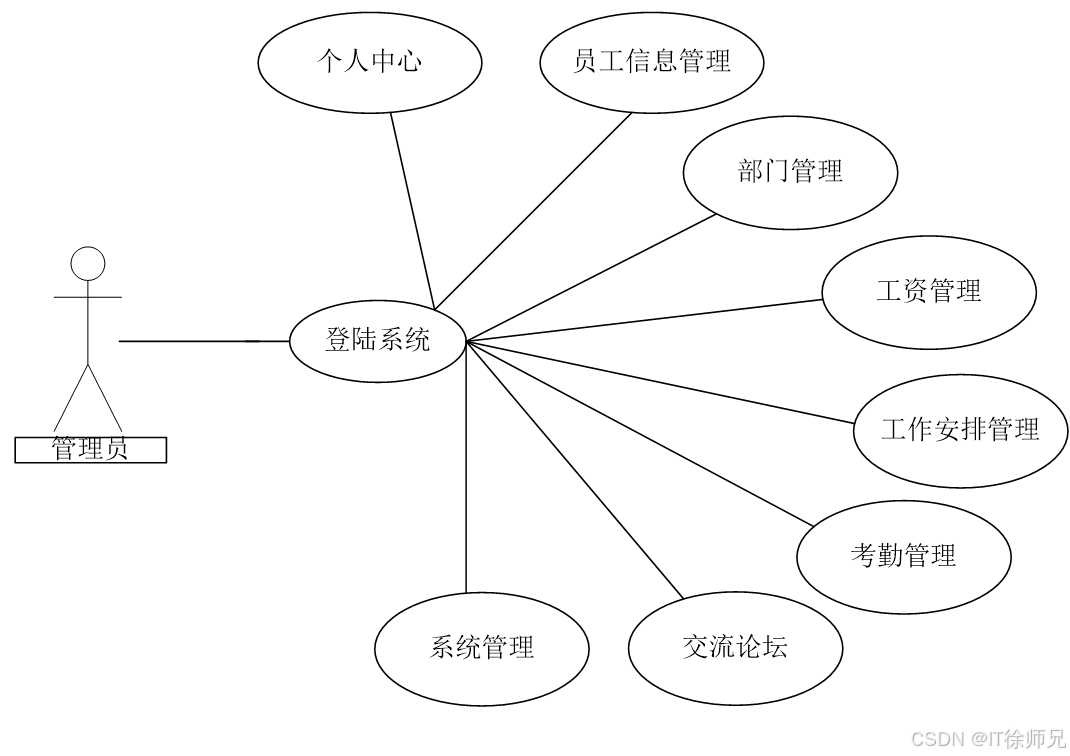 本系统的主要角色为管理员和员工,管理员的用例包括员工管理、考勤管理、部门信息、工资信息、工作安排管理、交流论坛管理等。管理员的用例图如下图所示: