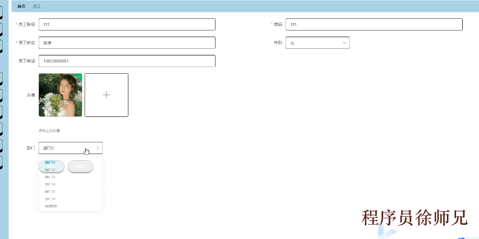 员工信息管理功能分为管理员管理员工信息和员工自己管理自己的信息两种,管理员可以看到员工的各项基本信息,可以删除员工的基本信息。添加员工信息功能的界面实现效果如下图4.4所示: