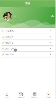 在我的界面里可以查询工资信息、工作安排信息、考勤信息、我发布的帖子和发布帖子。我的功能实现界面如下图4.10所示: