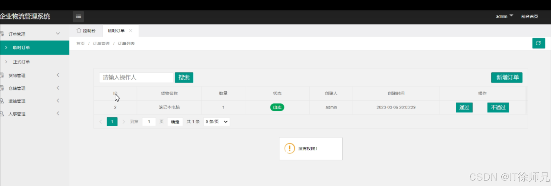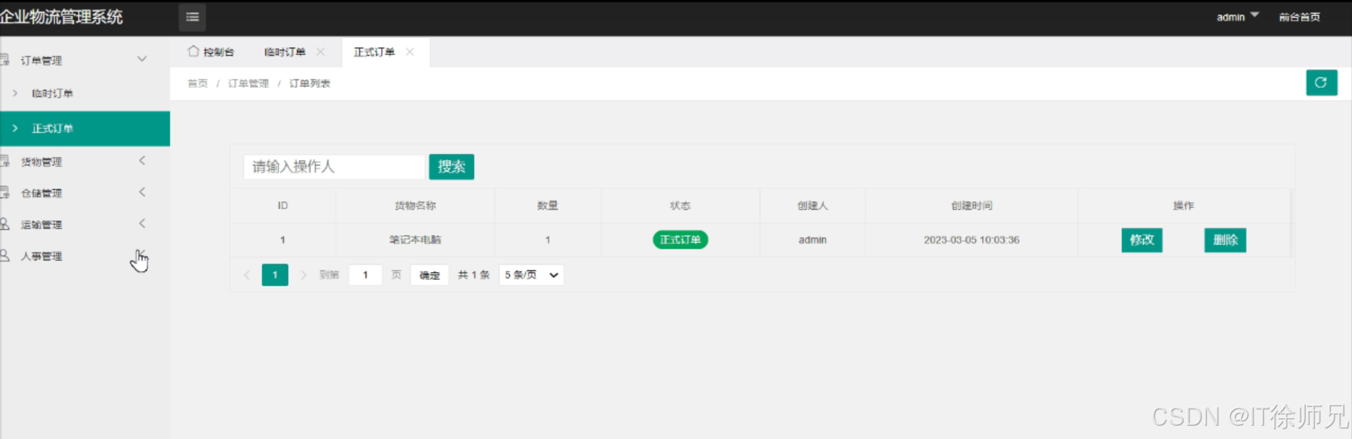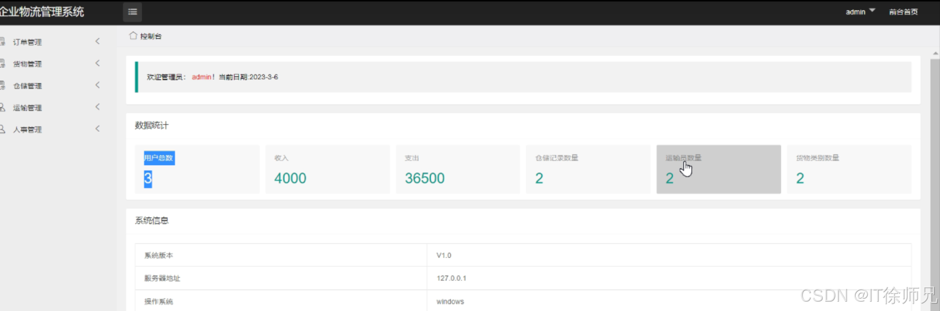 该界面显示设计的5各功能模块,订单管理,货物管理,仓储管理,运输管理,人事管理。并且还有基本的数据汇总,方便用户查看,下面还有系统信息。
