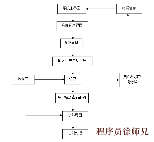 分析程序的流程,涉及到程序的整体操作流程,通过分析与设计,绘制的程序操作流程图见下图。此程序为了确保安全,会让使用者通过登录模块验证信息,符合要求的使用者才有权限操作程序。