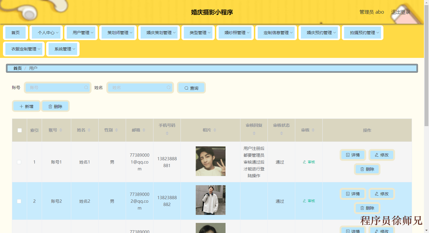 此页面让管理员管理用户信息数据,管理员可以对用户信息进行添加,修改,删除,查询操作。