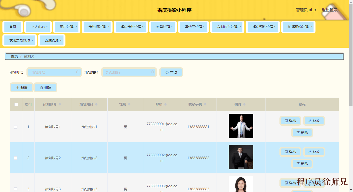 管理员可以对策划师信息进行添加,修改,删除查询操作。