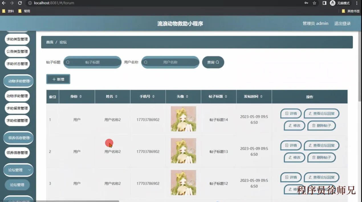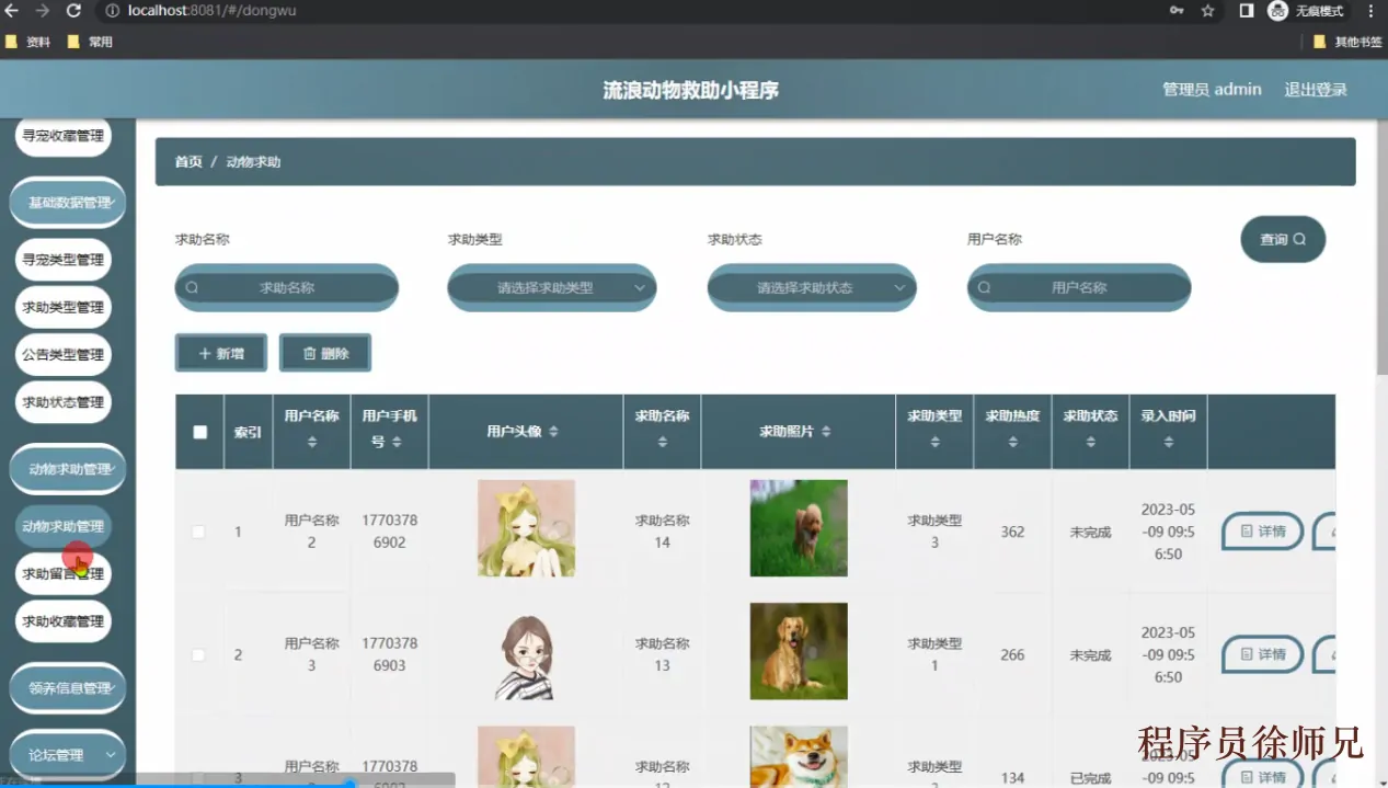 如图5.3显示的就是动物求助管理页面,此页面提供给管理员的功能有:根据动物求助进行条件查询,还可以对动物求助进行新增、修改、查询操作等等。