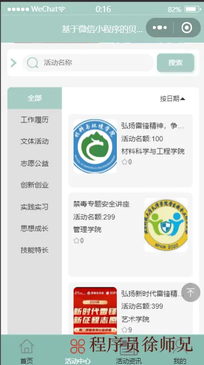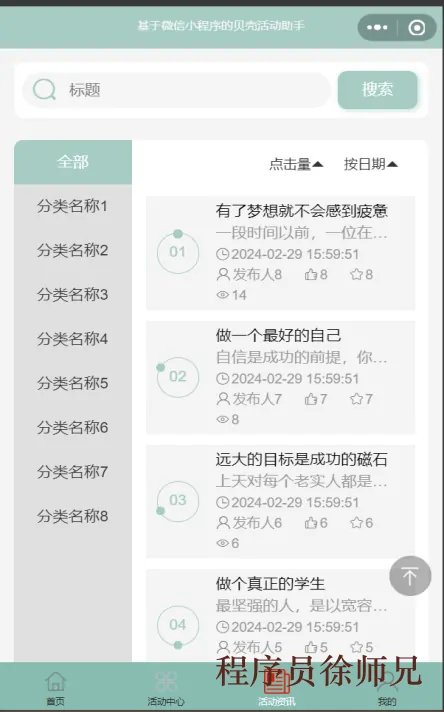 活动资讯模块按类型和日期为用户展示相关的活动资讯,用户可以根据分类名称、点击量和日期进行筛选展示,还可以通过标题关键字搜索特定的资讯内容。如下图5.5所示。