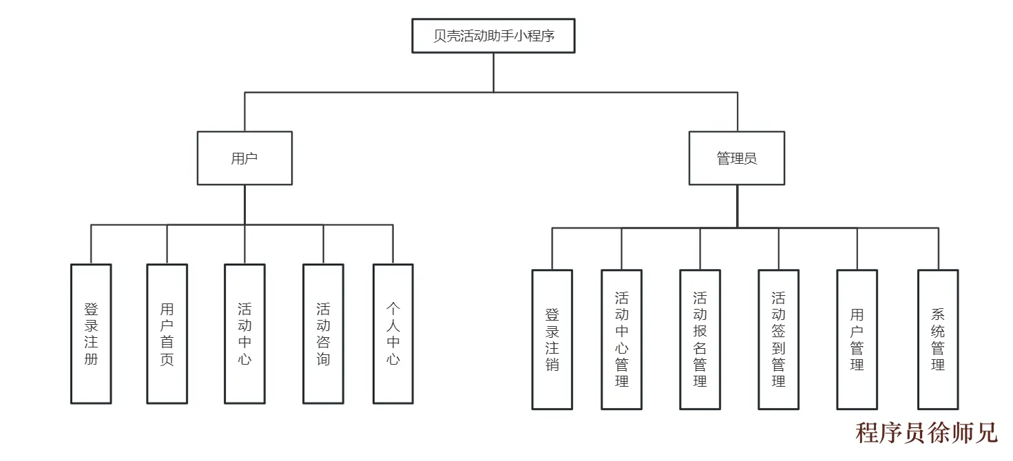经过对系统的需求分析,用户角色包括四个功能模块:用户首页、活动中心、活动资讯、个人中心等,为用户了解和参加活动提供了便捷的功能。对于管理员角色,系统提供了五个管理模块:用户管理、活动中心管理、活动报名管理、活动签到管理和系统管理。这些模块使管理员能够维护用户信息、管理活动列表、处理活动报名和签到事宜,以及进行系统级的配置和更新,保证系统的顺畅运行和用户体验的优化。系统整体功能模块如下图4.2所示。