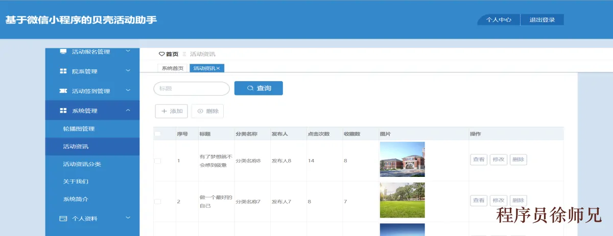 系统管理模块有轮播图、活动资讯分类、关于我们和系统简介,及活动资讯的全面管理。轮播图管理允许上传和编辑首页图片以突显主要活动;活动资讯分类和详细的活动资讯的均提供了增删改查功能;关于我们和系统简介部分提供平台和操作的基本信息,均支持富文本编辑。如下图4.8所示。