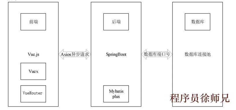 本系统在设计过程中采用了前后端分离的想法,将后端框架简洁为三层结构,分别是控制层、业务逻辑层和持久层;该系统前端使用的是Vue框架,使用Vuex、Axios、VueRouter等技术,制作工具是HBuilderX,后端采用Java语言,使用SpringBoot框架,采用Mybatis、Redis等技术完成,制作工具为IDEA,小程序端使用的是vant-ui等技术,制作工具为微信开发者工具,前后端通过Ajax技术实现跨域传值,数据使用JSON格式封装。将获取的数据以JSON格式返回小程序,小程序渲染数据并展示在用户交互界面中,实现前后端分离用户交互流程。前后端交互进行跨域处理,用户端使用微信小程序前端技术搭建小程序,管理员端使用SpringBoot搭建基本框架,用户端使用Axios向管理员端发起数据请求,使得各功能之间相互独立。系统架构图如图4.1所示。