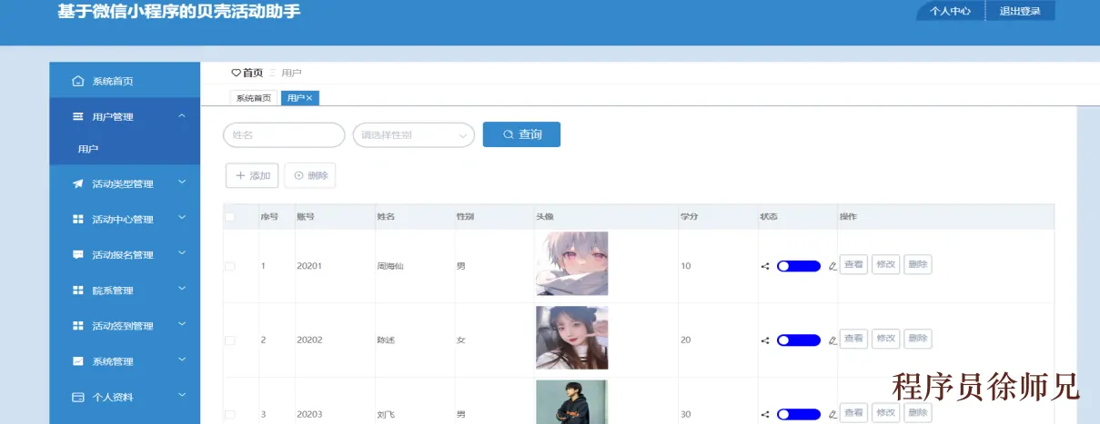 接下来是管理员端的功能的实现,主要为用户管理,活动中心管理,活动报名管理,活动签到管理以及对系统的管理几部分。