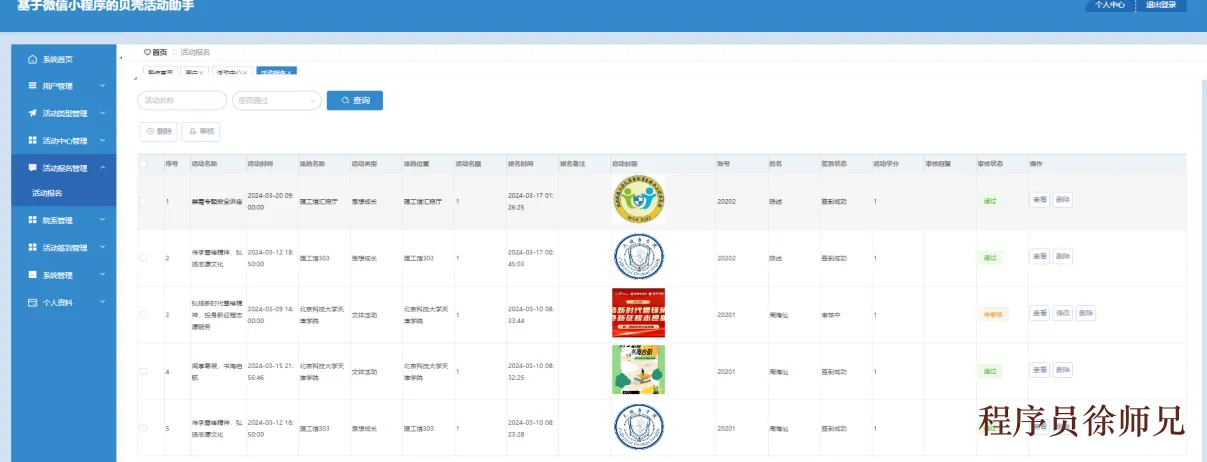 活动报名管理模块使管理员能够管理用户的活动报名信息,对报名记录进行删除、查看报名详情和审核报名请求,还能输入活动名称和选择是否通过进行活动查询。如下图4.7所示。