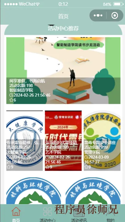 首页模块为用户提供了直观的操作界面,首页展示了活动推荐、活动资讯和系统介绍三个主要部分。用户进入小程序后,首先看到的是系统推荐的活动中心列表,方便用户快速找到感兴趣的活动,对相关活动进行了解并参与活动。如下图4.1所示。