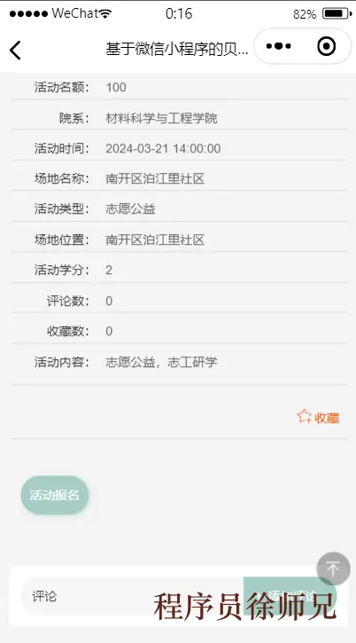 详情页包括活动的详细介绍、时间、地点等信息,用户可以在此页面进行活动报名、发表评论和收藏活动。如下图5.4所示。