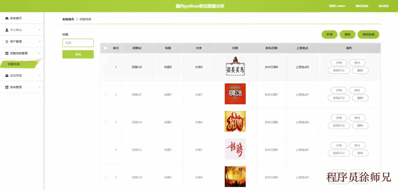管理员点击招聘信息管理。在招聘信息页面输入标题进行查询、新增、爬取数据或删除招聘信息列表,并根据需要对招聘详情信息进行详情、修改、查看评论或删除操作;如图4-6所示: