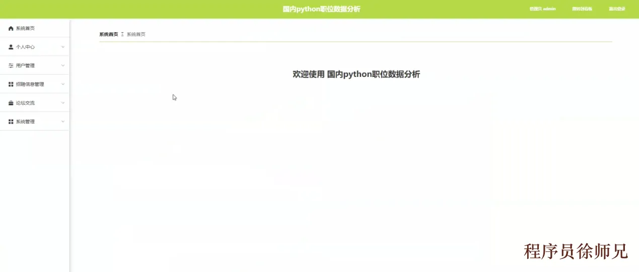 管理员进入主页面,主要功能包括对个人中心、用户管理、招聘信息管理、论坛交流、系统管理等进行操作。管理员主页面如图4-4所示: