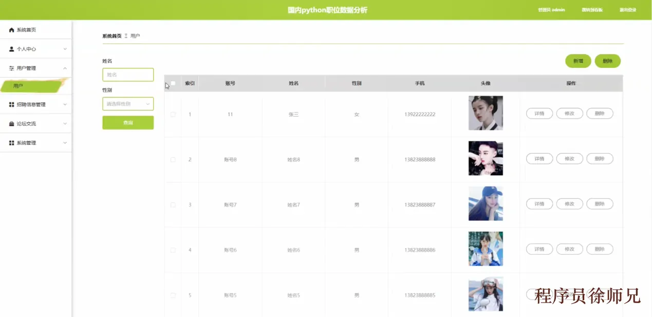 管理员点击用户管理。在用户页面输入姓名和选择性别进行查询、新增或删除用户列表,并根据需要对用户详情信息进行详情、修改或删除操作;如图4-5所示: