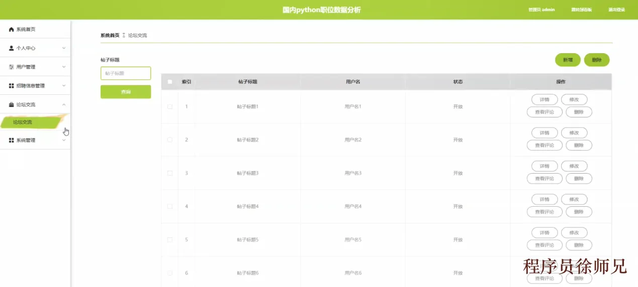 管理员点击论坛交流。在论坛交流页面输入帖子标题进行查询、新增或删除论坛交流列表,并根据需要对论坛交流详情信息进行详情、修改、查看评论或删除操作;如图4-8所示:
