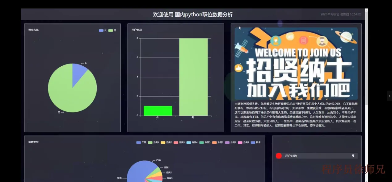 管理员进行爬取数据后,点击主页面右上角的看板,可以查看到系统简介、男女占比、用户情况、招聘类型、用户总数、招聘信息总数等等实时的分析图进行可视化管理;如图4-7所示: