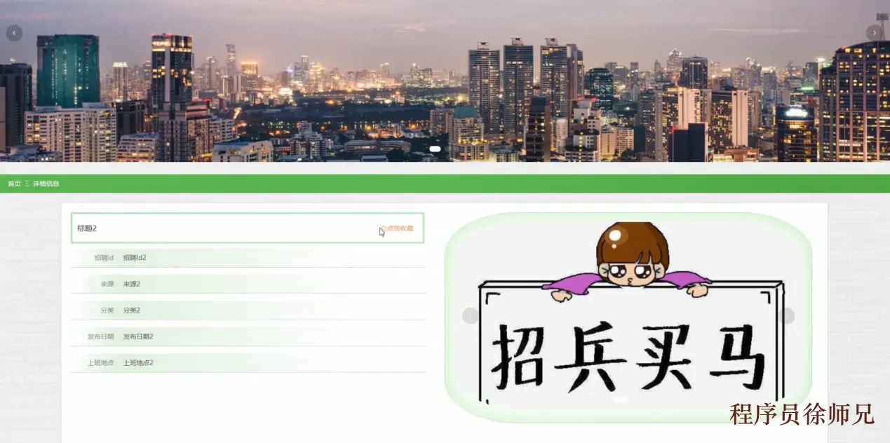 招聘信息:在招聘信息页面的输入栏中输入标题进行查询,可以查看到招聘详细信息,并根据需要进行评论或收藏操作;招聘信息页面如图4-2所示: